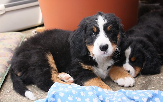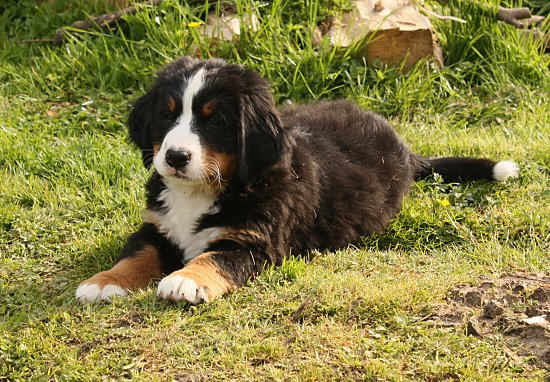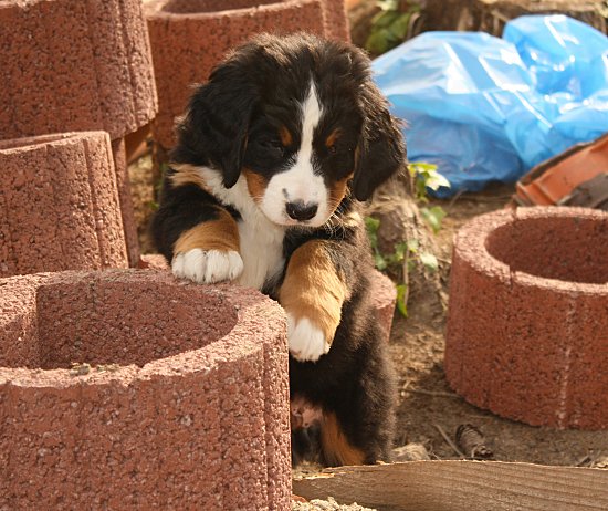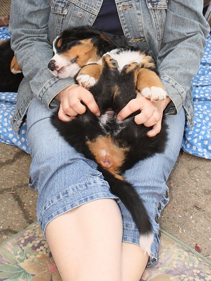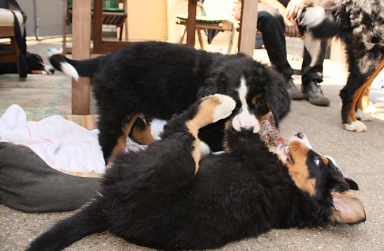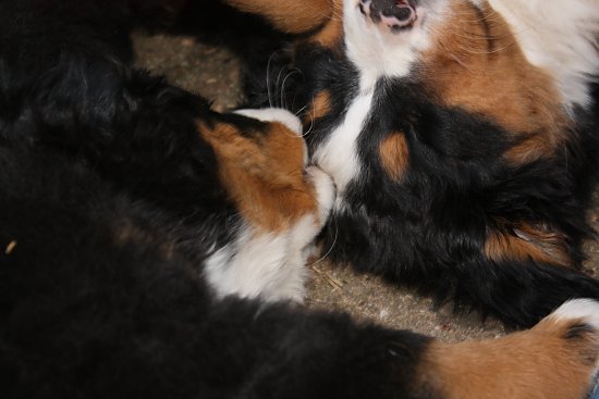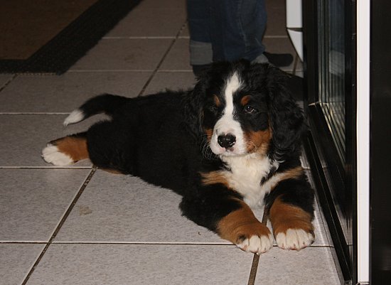 Von den großen Bernern habe ich auch schon eine ganze Menge gelernt. Zum Beispiel, an welchen Stellen im Haus man am meisten beachtet wird. Bestens geeignet sind dafür Türen und Durchgänge. Im Weg liegen funktioniert immer!