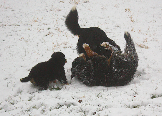 Seit Weihnachten liegt hier Schnee. Ginja hat darüber ja schon berichtet. Jetzt haben wir schon wieder Ende Januar und es schneit immer noch. Ich finde das klasse. Und Ginja ebenfalls. Aber eigentlich will ich euch von meinem verspäteten Weihnachtsgeschenk erzählen. Am 23.01.2010 packten mich Frauchen und Herrchen ins Auto und Ginja musste zu Hause bleiben. Dann sind wir lange gefahren und erst bei meinen Eltern wieder ausgestiegen. Haben die sich gefreut. Papa durfte ich zwar nicht sehen, dafür aber all die Mädels und natürlich Mama, mit der man schön spielen kann. Und dann rannte da noch so eine plüschige kleine Rennsemmel namens Duncan rum. Das ist ein Halbbruder von mir, hat also den selben Papa. Aber irgendwie sah der Kleine seltsam aus. Zu heiß getrocknet und einen riesigen Pelz am Leib. Dazu sehr frech und auch noch schnell auf den Beinen.