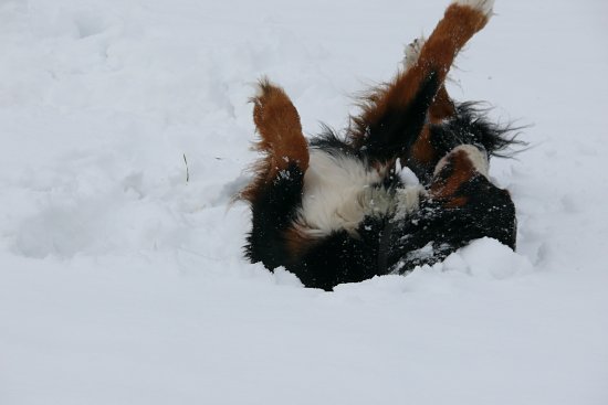 während Ginja mit ihren kurzen Beinchen den Schnee unter ihrem Bauch eher mit gemischten Gefühlen betrachtete.