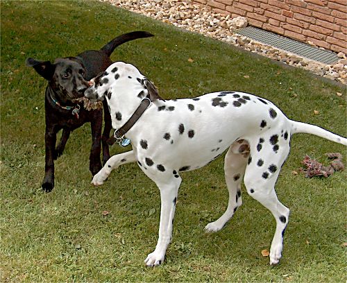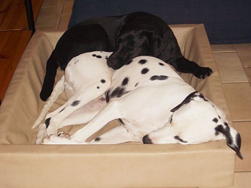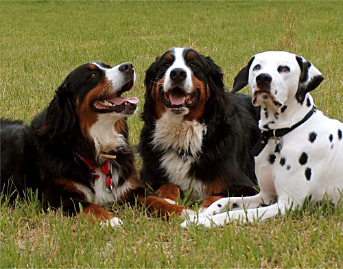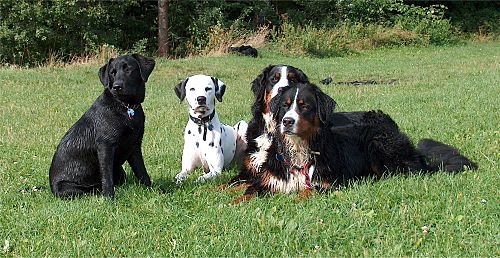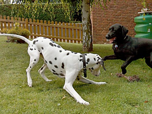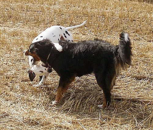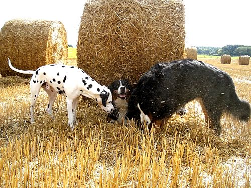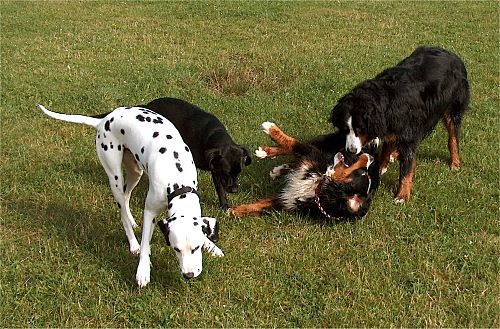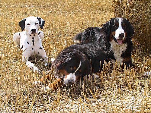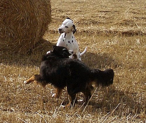 Ich bin froh, dass Frauchen eingesehen hat, dass es keinen Sinn hat, mich in irgendwelche Hundeschulen zu schleppen. Hat mich jedenfalls ordentlich viel Arbeit gekostet, sie hiervon zu überzeugen. Dafür nimmt sie immer Ginja mit, der das wenigstens Spaß zu machen scheint. Und ich habe endlich meine Ruhe. Denkste! Figo, den schimmeligen Fehlfarbenberner, manchmal auch Pünktchen genant, kennt Ihr ja. Dass ist der Dalmatiner von Herrchens Schwägerin Iris. Und das ist ein furchtbarer Hektiker. Der hat so gar nichts von einem Berner Sennenhund an sich. das wir ab und zu zusammen spazieren gehen, ist ja schon in Ordnung. Immerhin kann er dann mit Ginja rumtoben und ihr dabei auf die Nerven fallen. Aber jetzt? Jetzt hat er sich tatsächlich auf Dauer hier bei uns zu Hause einquartiert! Herrchen sagt zwar, dass das nur für zwei Wochen ist. Aber wisst Ihr eigentlich, wie lang zwei Wochen sein können? Die ersten Tage waren echt furchtbar. Dann wurde es ein wenig besser. Aber schaut selber: