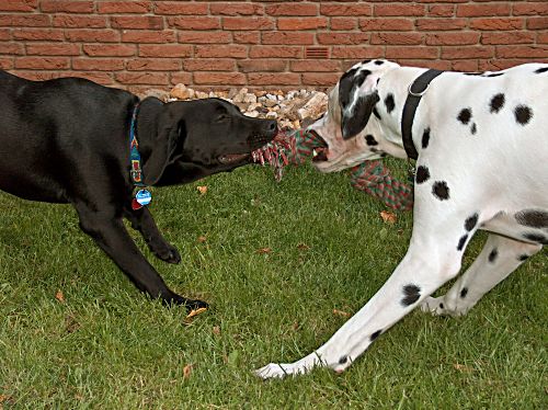 Hier haben sie eine Kordel und zerren sich gegenseitig durch den Garten.