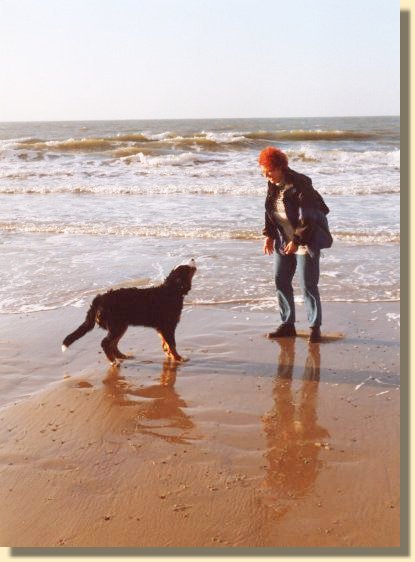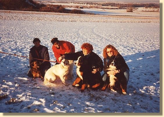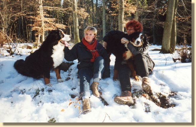Anton mit Frauchen links, Domino mit Frauchen rechts
