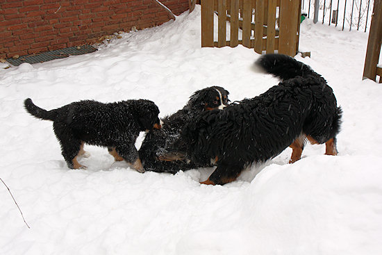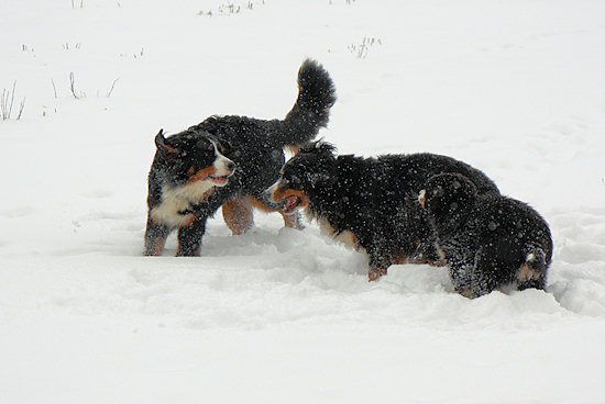 Die beiden anderen Schneebären lassen sich auch nicht lange bitten und so geht die Toberei los.