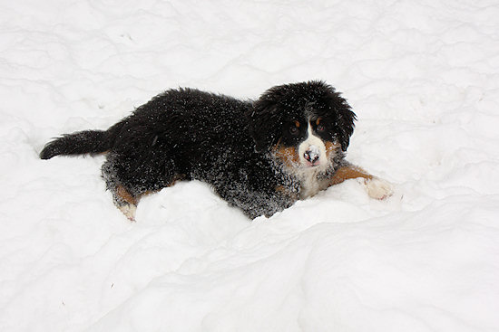 Unser Berner Sennenhundwelpe Duncan liegt im Flur und langweilt sich sichtlich. Draußen liegt jede Menge Schnee und da möchte er hin.