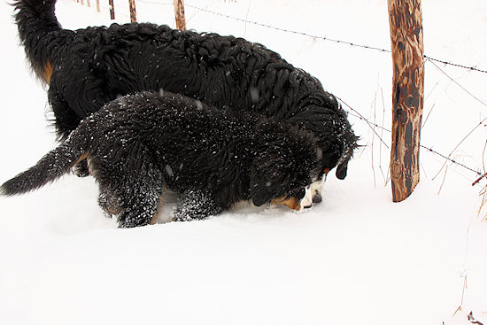Camillo startet schon wieder eine Attacke auf Ginja, die sich viel lieber in Ruhe im Schnee wälzen würde.