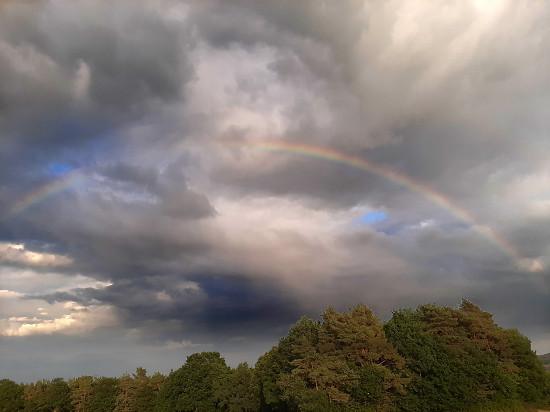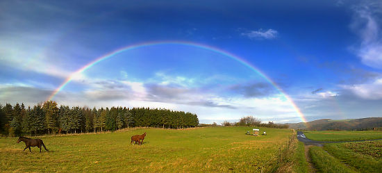 Ein Regenbogen über Sierscheid, das hinter diesen Bäumen liegt.