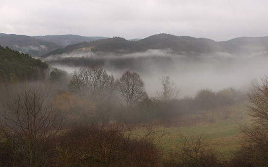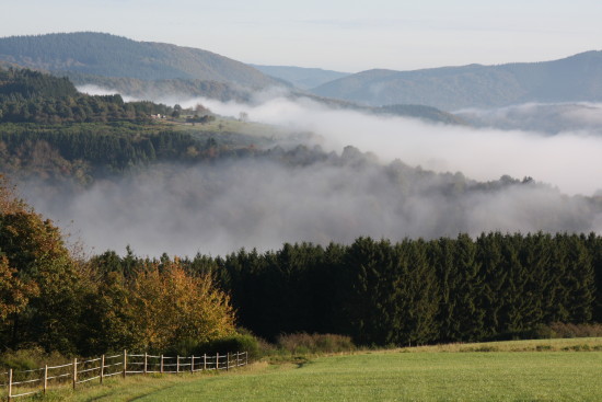Nach einem Gewitter hängen die Wolken tief und kriechen über das Ahrgebirge.