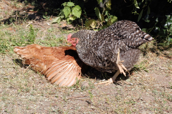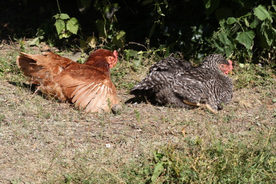 Unsere Hühner beim Sonnenbaden. Dass ich da mit der Kamera herumlaufe, stört sie nicht im Geringsten.