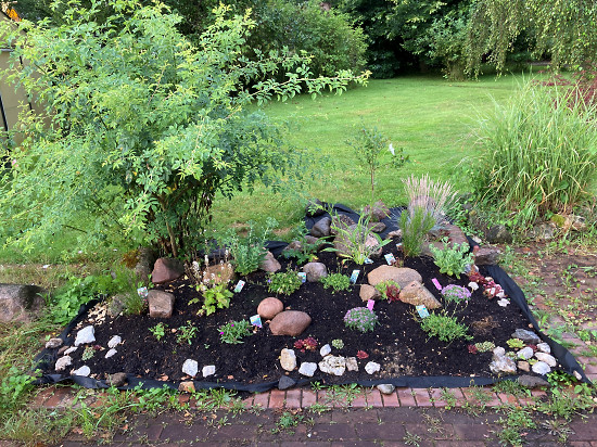 Dazu mussten zunächst alle Steine und eine, wie sich beim Ausgraben zeigte, ziemlich große Waschbetonschale, entfernt werden. Dabei wurde auch sämtlicher Bewuchs ausgemacht und, soweit noch verwendbar, zur Seite gelegt. Der Untergrund entpuppte sich als Lavahügel und wurde beibehalten. Darauf kam ein verrottbares Unkrautvlies und darauf Blumenerde. Und hierauf wurden einige Steine platziert, so dass sich ein gefälliges Bild ergab. Da hinein kamen dann neue Bodendecker und wenige alte der noch brauchbaren Pflanzen. Inzwischen blüht davon schon so einiges. Perspektivisch soll das Ganze zusammenwachsen und den Boden ganz bedecken. Dabei sollen die Steine natürlich sichtbar bleiben, sonst wäre es ja kein Steingarten mehr. Im Vergleich zu vorher, wo Stein an Stein lag, ist es so sehr viel luftiger und auch interessanter anzusehen. Weniger ist halt oft mehr.