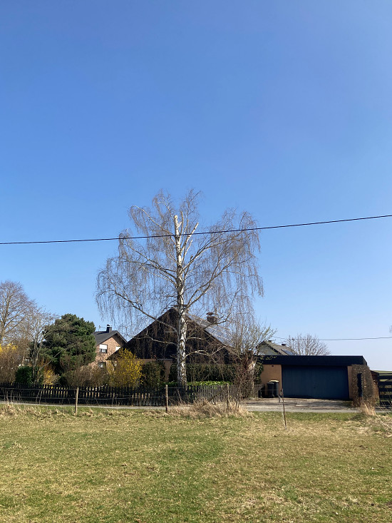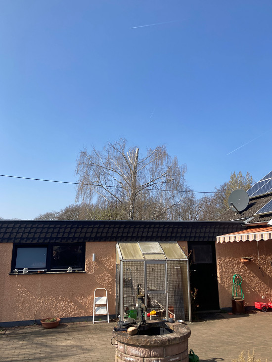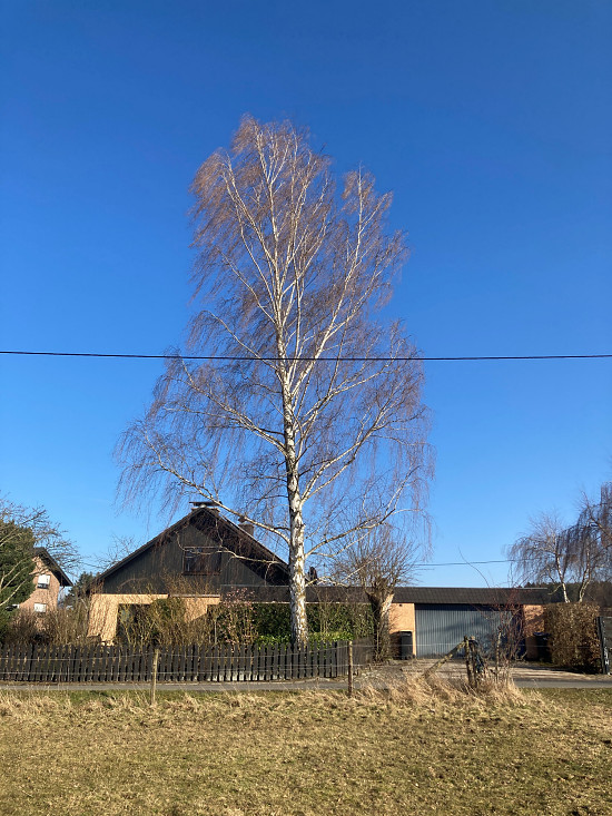Nach einer Reihe von kurz aufeinanderfolgenden Stürmen Mitte Februar 2022 (Ylena, Zeynep, Antonia) stand die große Birke am Haus leicht schief. Anders ausgedrückt, es bestand die, wenn auch eher geringe, Gefahr des Umkippens. Also haben wir sie kappen lassen.