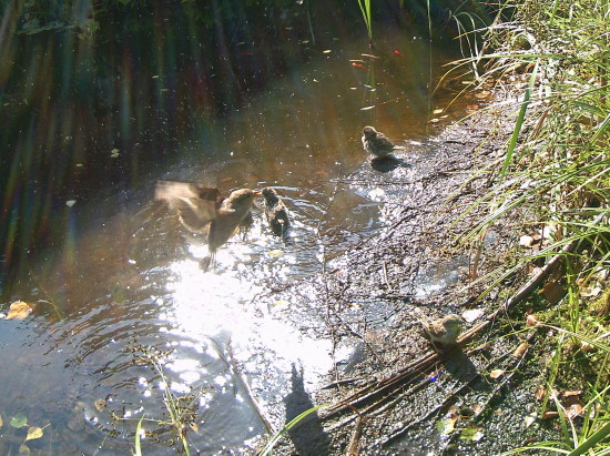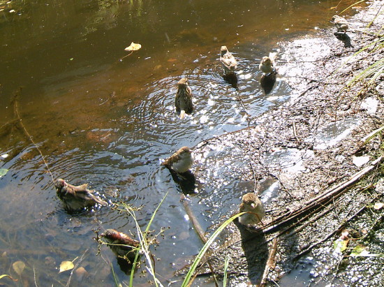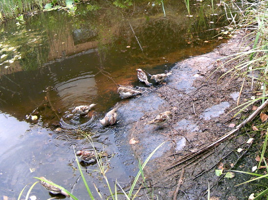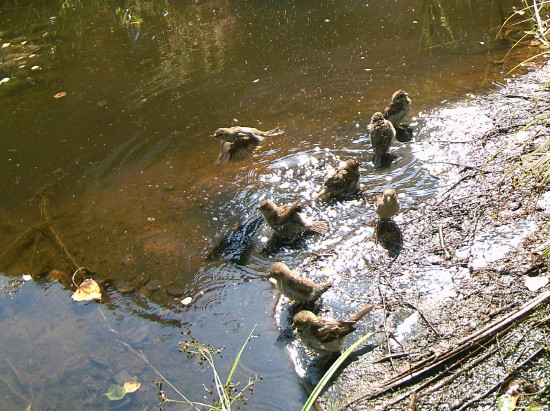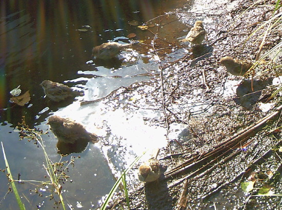 rechts badenden Spatzen, die sich in den letzten Jahren sehr stark