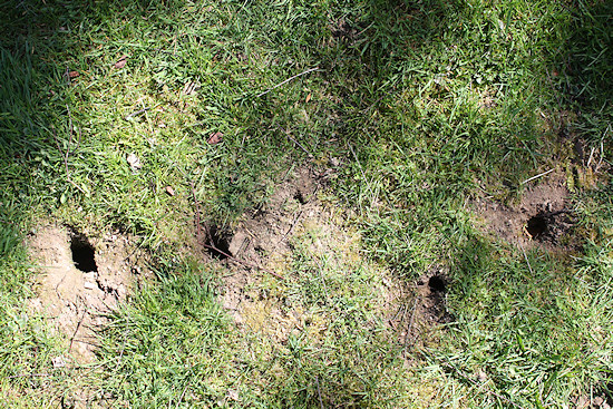 Nicht nur an manchen Stellen sieht unser Rasen derzeit so aus. Wenn man durch den Vorgarten geht, meint man im Hochmoor zu sein, so sinkt man ein. Da ist ein Mäusegang neben dem nächsten.