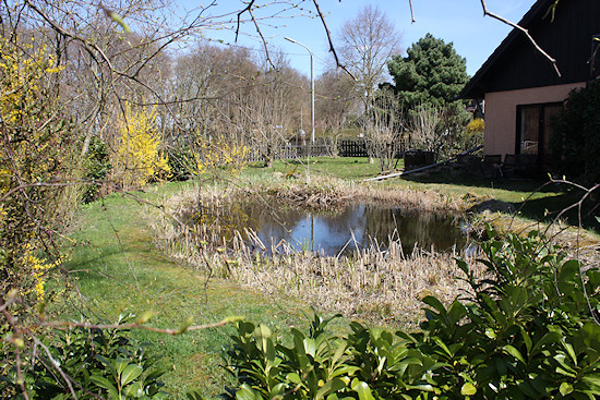 Der Bärlauch mit dem Holunder, im Hintergrund der Gartenteich.