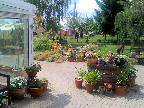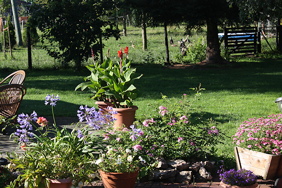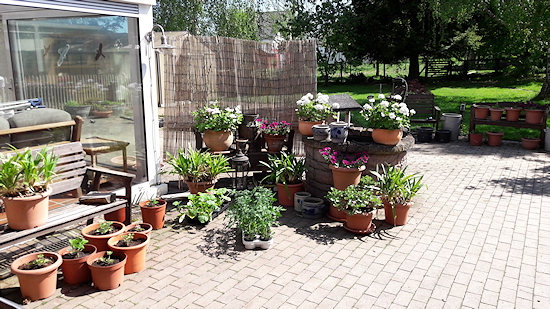 Jede Menge Töpfe und Kübel bevölkern die Terrasse.