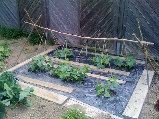 Eine Eigenkonstruktion, um den Gurken eine Rankhilfe zu bieten. Das Gestänge stammt aus dem Strauchschnitt im letzten Herbst.