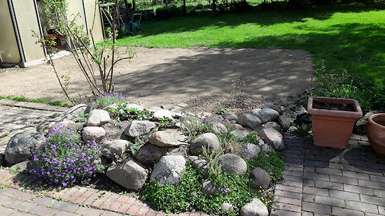 Dort, wo vorher eine Holzterrasse war, habe ich jetzt Mutterboden angefüllt und Rasen gesät. Der Steingarten wurde dabei ebenfalls hergerichtet und teilweise neu aufgefüllt, nachdem uns die Mäuse dort ziemliches Durcheinander hinterlassen hatten. Eine Blaubeere, die angeblich auf normalem Gartenboden wachsen soll, wurde vor dem Steingarten platziert. Ein Halbkreis aus Kopfsteinpflastersteinen bildet eine optische Abgrenzung zum Rasen. Dabei sind die Steine Bodeneben gesetzt, damit sie beim Rasenmähen nicht stören.