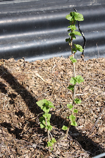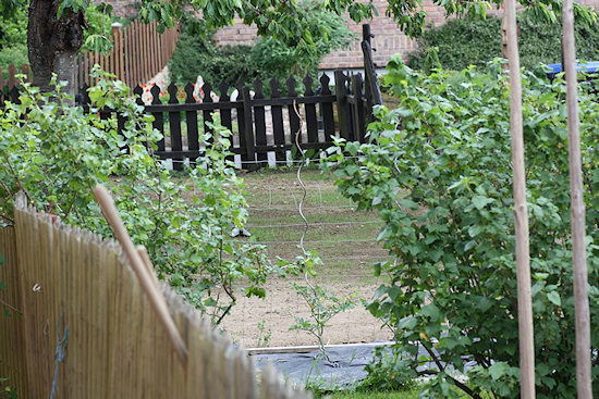 Damit wir möglichst lange über das Jahr Obst ernten können, haben wir zwei Honigbeeren oder Kamschatkabeeren gepflanzt. Das arktische Gewächs treibt früh und trägt auch früh. Aber es wächst langsam und so müssen wir uns noch zwei bis 3 Jahre gedulden, bis wir die ersten Beeren probieren können. Wenigstens müssen wir uns keine Sorgen wegen möglicher Frostschäden machen. Dahinter steht eine Tayberry (eine Kreuzung aus Brombeere und Himbeere) und dann kommen zwei der eigenen Stecklinge. Ob Johannisbeere oder Jostabeere weiß ich noch nicht.