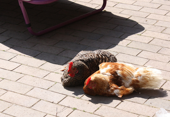 Etwas vorher schrieb ich, dass Hühner gar nicht so dämlich sind. Diese beiden fanden immer einen Weg über den Zaun, weil es auf der Terrasse doch so viel schöner ist. Eines der Hühner setzte sich sogar neben meiner Frau auf die Bank. Und das beileibe nicht nur ein Mal.