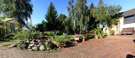 Ein Überblick über die Terrasse mit Blick auf den Steingarten. Links sieht man das alte Gewächshaus. Die Aluminiumkonstruktion ist in Ordnung, aber die Kunststoffstegplatten sind hin.