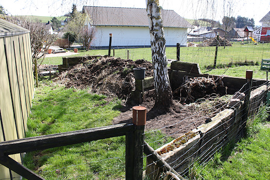 Nach den Erfahrungen mit dem Pferdemist benutzen wir jetzt unseren eigenen Kompost, der in zwei Kammern reifen kann. Der Mist war ohnehin nur eine Übergangslösung, weil wir ja anfangs noch gar keinen Kompost hatten. Hier auf dem Bild ist die vordere Kompostierkammer leer geräumt und nur das Blumenrohr ist übrig geblieben. Ob es auch in diesem Jahr noch einmal wächst, müssen wir abwarten.