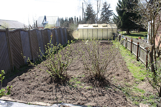 Der Kompost ist auf das Pflanzfeld aufgetragen, mit der Motorhacke eingearbeitet und schon ist der Boden für die Pflanzen bereitet. Hier vorne stehen eine rote und eine schwarze Johannisbeere sowie eine Jostabeere. Aus den dreien habe ich mittels Stecklingen neue Pflanzen gezogen. Dazu reicht es, im Herbst ein paar Äste in den Boden zu stecken und zu warten. Allerdings ist es von Vorteil, wenn man sich aufschreibt, welche Sorte wo steht. Jetzt habe ich die 8 ausgetriebenen von 9 Stecklingen umgepflanzt und warte gespannt darauf, was wo steht.