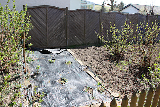 Auch hier steht Giersch. Zusätzlich wuchern die Heckenrosen in das Pflanzfeld über. Mit dieser Folie lässt sich das recht einfach unterbinden.