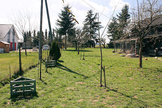 Hier stehen links meine Johannisbeeren und vor den Thuja eine Stachelbeere und dahinter noch mal zwei Beeren. Langsam entwickelt sich ein "All you can eat- Garten". Der junge Baum vorne ist eine Mirabelle "Von Nancy", die im letzten Herbst das erste Mal Früchte getragen hat. Und dann gleich so viele, dass die Äste sich bogen und angebunden werden mussten. Gesetzt haben wir sie im Frühjahr 2011 zusammen mit den anderen Obstbäumen. Sie hat also 3 Jahre bis zum ersten Ertrag gebraucht. Dahinter steht die Birne (Sorte "Williams Christ"), die leider immer wieder vom Birnenrost befallen wird. Gleiches gilt für den älteren Birnbaum, der schon beim Hauskauf dort stand.