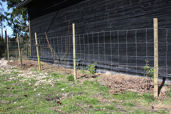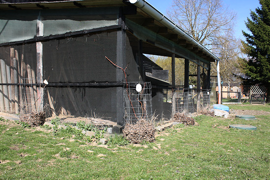 Unsere Weinstöcke, dick mit Mulch abgedeckt. Es handelt sich hier um vier verschiedene kernlose bzw. kernarme Tafeltrauben, die zum Verzehr gedacht sind. Das heißt, wenn wir hier in der Höhenlage irgendwann einmal einen Ertrag bekommen sollten. Aber wer nicht probiert... Der Draht der Voliereneinzäunung dient als Kletterhilfe.