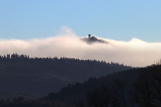 einem ansonsten völlig wolkenfreien Wintertag liegt die Nürburg im Nebel