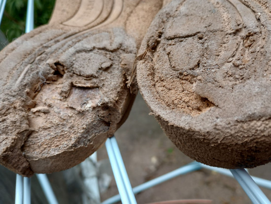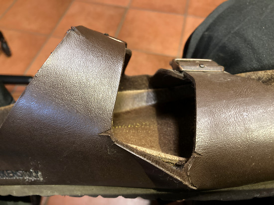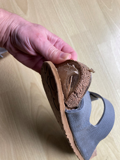 Dabei habe ich mir die Geschichte mit der abgelösten Sohle schon gespart. Daneben war die Sohle von Anfang an etwas zu kurz an der Ferse (linker Schuh). Auch wenn es nicht einmal ein ganzer Millimeter war, der da gefehlt hat, führte das doch im Laufe der Zeit dazu, dass dort der Kork allmählich abbröckelte. Aber ich wollte ja nicht meckern.