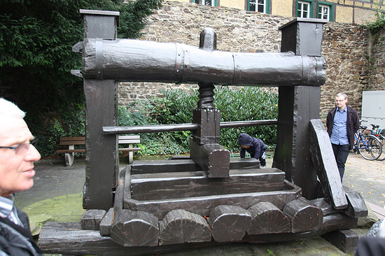 Eine alte Traubenpresse steht neben dem