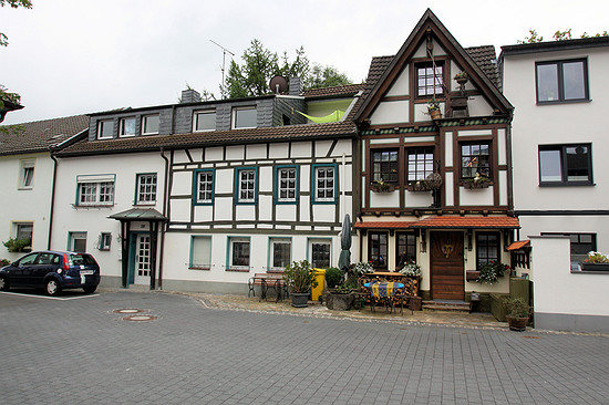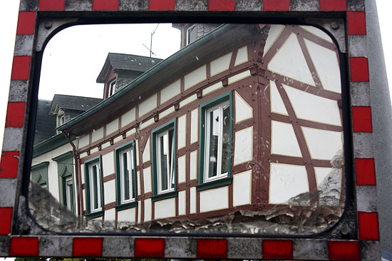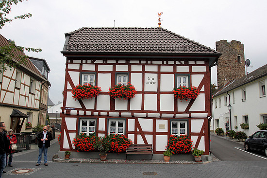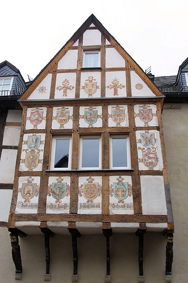 Fachwerkkunst. Die Häuser lehnen sich in der Tat aneinander an und geben