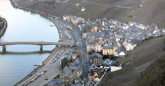 Ein Überblick über Bernkastel-Kues. Im Vordergrund Bernkastel, auf der anderen Moselseite Kues. Oberhalb liegt das Kueser Plateau mit den Kliniken.