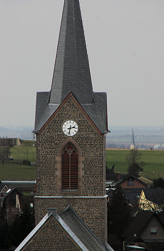 Zoom on. Die beiden Kirchtürme liegen ca. 8-10 km auseinander. Der Hintergrund wurde bearbeitet, um den Kontrast zu erhöhen, der Kirchturm im Vordergrund selbst nicht.