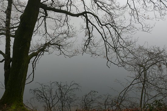 Die Steinbachtalsperre im dichten Nebel.