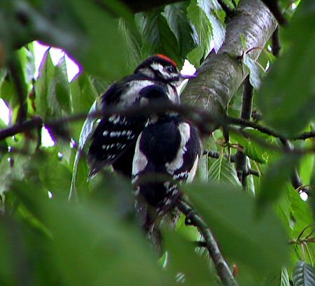 Buntspechtpärchen im (inzwischen leergefressenen) Kirschbaum.