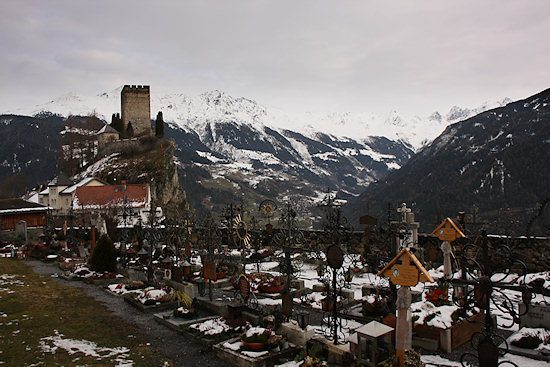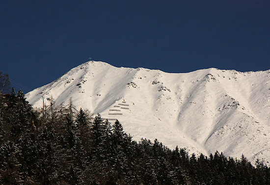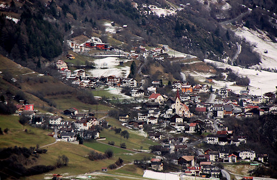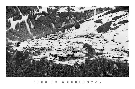 Ein Blick auf die gegenüberliegende Seite mit Fiss und dem darüber befindlichen Schigebiet.
