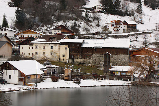 Gegenüber von Fiss liegt auf der anderen Talseite Fendels. Von dort aus hat man einen schönen Blick auf die Burg Laudegg. Aus dieser Perspektive ist es kaum zu glauben, dass dahinter ein ziemlich großer Dorfteich verborgen liegt.