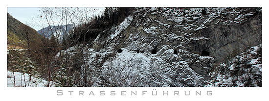 Zum guten Schluss waren wir noch einmal in Samnaun, hatten aber wieder kein Glück mit dem Wetter. Es war neblig und wolkenverhangen, Das Einzige, was zeigenswert ist, ist der Verlauf der Straße. Es gibt davon zwei, die von der B180 hinter Pfunds innerhalb von weniger als 50m abgehen. Die offenbar ältere, längere und schönere ist die von Pfunds aus gesehen hintere. Teilweise sind Abschnitte grob in den Fels gesprengt worden, unbeleuchtet und einspurig, so dass man sich darauf verlassen muss, das der Gegenverkehr von oben einen sieht und wartet. Das Feeling innerhalb des Tunnels hat etwas von einer Geisterbahn an sich, ist aber vielleicht gerade deshalb besonders reizvoll. Die neuere Straße bietet bei weitem nicht dieses Gefühl von Abenteuer und auch die schlechteren Ausblicke, ist dafür kürzer, besser ausgebaut, aber auch deutlich steiler.