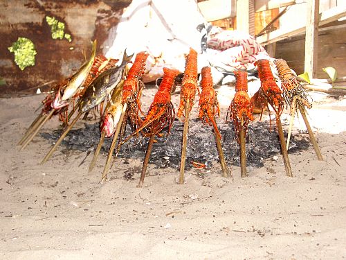 Ein Erlebnis, dass mehr ist als der Genuss von Nahrungsmitteln: In einem der Hütten am Strand wurden auf einem frisch aus Palmenblättern geflochtenen Tischchen Fisch und Langusten serviert. Gegessen wurde auf dem Boden sitzend mit den Fingern. Dazu wurde reichlich Obst, warmes Bier, Cola und Wasser gereicht. Einfach nur schön. Preis: 10 € pro Person.