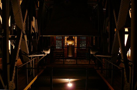 Die große Glocke in der Mitte des Glockenstuhls. Es müsste sich um die St. Petersglocke handeln.
