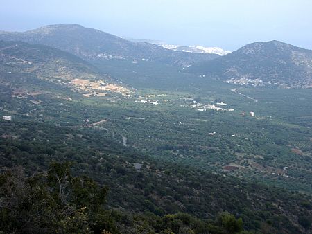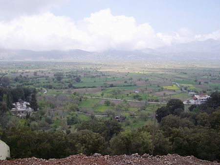 Blickt man zur anderen Seite, hat man einen wunderschönen Ausblick auf die fruchtbare Ebene, die in früheren Zeiten mit windgetriebenen Wasserpumpen übersäht gewesen ist. Heute locken nur noch einige Tavernen mit solchen Wasserpumpen Kundschaft. Die zur Ebene gehörigen Ortschaften befinden sich allesamt am Rand, um kein kostbares Ackerland zu verschwenden. Dementsprechend führt die Autostraße im Kreis ringsherum.