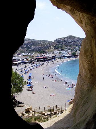 Blick aus einer dieser Höhlen auf den Badestrand von Matala.
