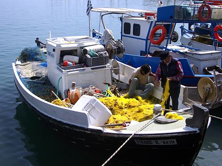 Auf der Mole und den Booten sind die Fischer mit der Reparatur ihrer Netze beschäftigt.