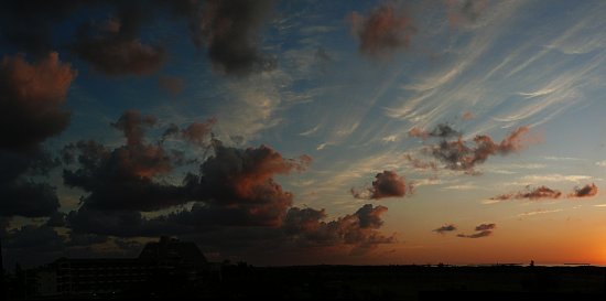 Ein Morgenpanorama. Rechts kann man den Wasserarm sehen, der Varadero von der Insel trennt. Nach rechts geht es nach Varadero, weiter nach Matanzas und auch nach Havanna. Links ist die Silhuette des Varadero Blau zu sehen, das sich als übernächstes Hotel in die Kette einreiht. Sicher der hässlichste Bau dort, aber auch am besten bewertet.