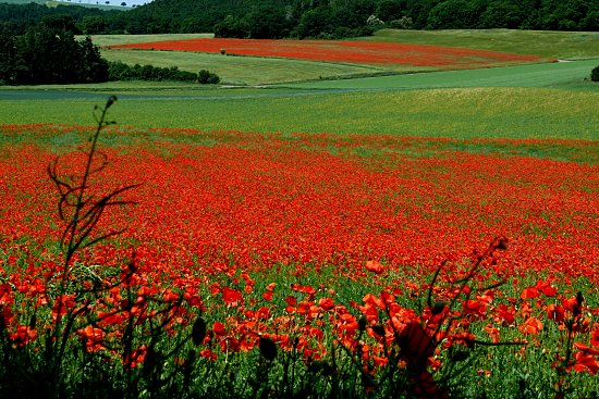 Häufiger Begleiter von Getreidefeldern ist Klatschmohn. Das er allerdings so massenhaft auftritt wie hier zu sehen, ist eher selten.