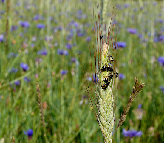 Kornblume, Marienkäfer und Getreiderispe. Der Marienkäfer hat noch den Morgentau auf seinem Panzer.