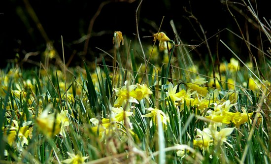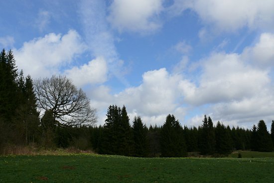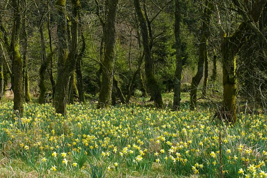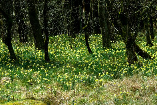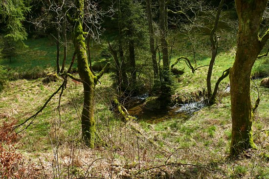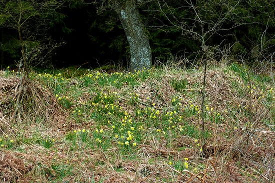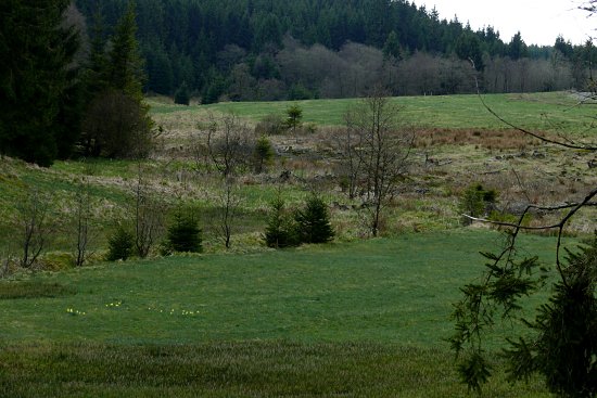 Vom Parkplatz Wahlerscheid aus geht ein gut ausgebauter Weg ein idyllisches Tal entlang des Krebsbachs bis nach Einruhr. Dort kommt man an dichten Fichtenwäldern vorbei, die nach und nach Buchenurwald weichen sollen. Entlang des Bächleins gibt es Feuchtwiesen, auf denen zu dieser Jahreszeit unzählige wilde Narzissen blühen.