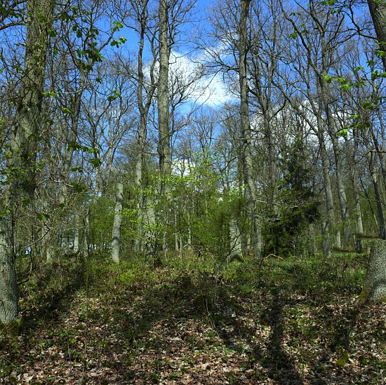 Die älteren Bäume (hier Eichen) sind noch unbelaubt.