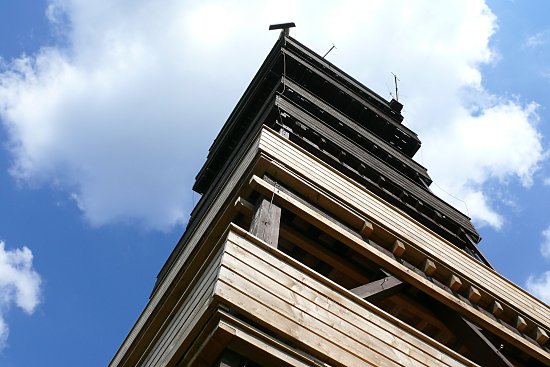 Der Aussichtsturm Wolfgarten. Es gibt insgesamt drei ähnliche Türme, die früher zur Feuersichtung genutzt wurden. Konnte man von allen drei Türmen aus Rauch sehen, konnte man den Ursprung durch Triangulation recht genau ermitteln. Heute erfolgt die Überwachung aus der Luft.